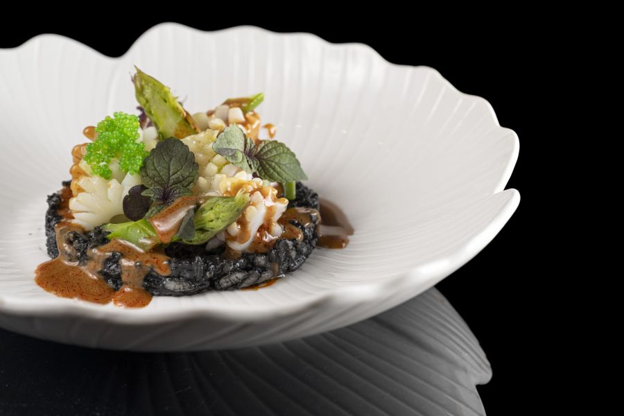 - L’encornet farci au boudin Basque et secreto Ibérique, crémeux paprika, persil, risotto de topinambour épinards jus de viande