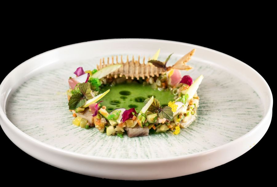 - Pavé de saumon, ragoût de légumes, jus d’une matelote, citron confit, chorizo, calamars